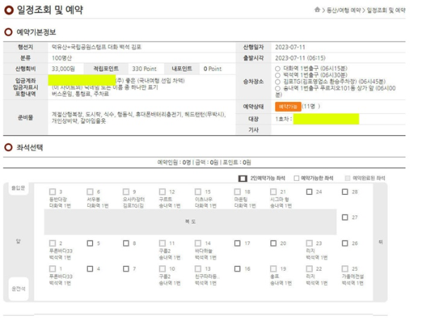 다음으로 좌석 선택하기입니다. 일정조회 및 예약 페이지 밑부분을 보시면 이렇게 좌석 선택 페이지가 나오는데요.
